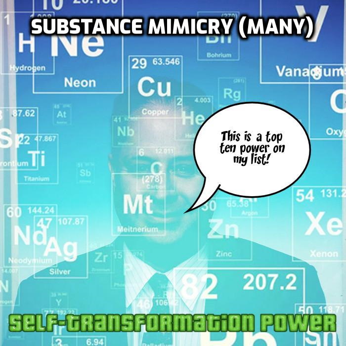Substance Mimicry (many) – The ability to turn one’s body into several substances. Substance Mimicry (many) is also known as Elemental Body, Elemental Form, Elemental Mimicry and Elemental Physiology. Unlike (415) Substance Mimicry (one) in which the character has a body only composed on one substance.
