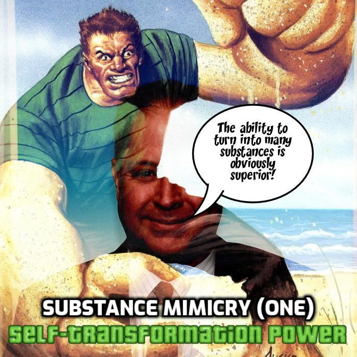 Substance Mimicry (one) – The ability to turn part of one’s body or entire body into a single substance and only that substance. The following are subcategories of this power include 008) Air Mimicry, 027) Antimatter Mimicry, 114) Crystal Mimicry, 154) Earth Mimicry, 221) Ice Mimicry, 265) Magma Mimicry, 288) Metal Mimicry, 310) Mirror Mimicry, 385) Sand Mimicry, 413) Stone Mimicry, 488) Water Mimicry and 497) Wood Mimicry.