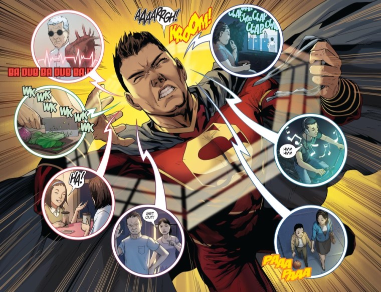 The New Super-Man (DC) struggles to control his super hearing in New Super-Man #8.