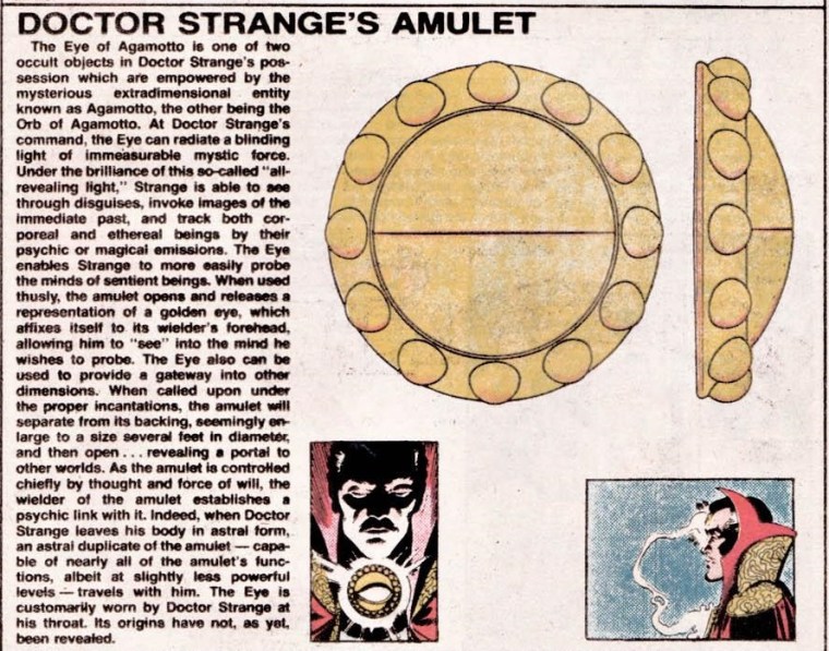 The Eye of Agamotto (Marvel) belongs to Doctor Strange and often referred to as an amulet and is probably the most powerful talisman in the Marvel Universe in Official Handbook of the Marvel Universe V1 #15. The Eye of Agamotto is a weapon of wisdom.