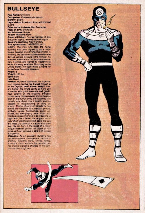 Bullseye (Marvel) can throw just about anything with deadly accuracy in Official Handbook of the Marvel Universe V1 #2.