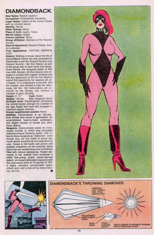 Diamondback (Marvel) throws knives but saves throwing diamonds for special targets in Official Handbook of the Marvel Universe V2 #3.