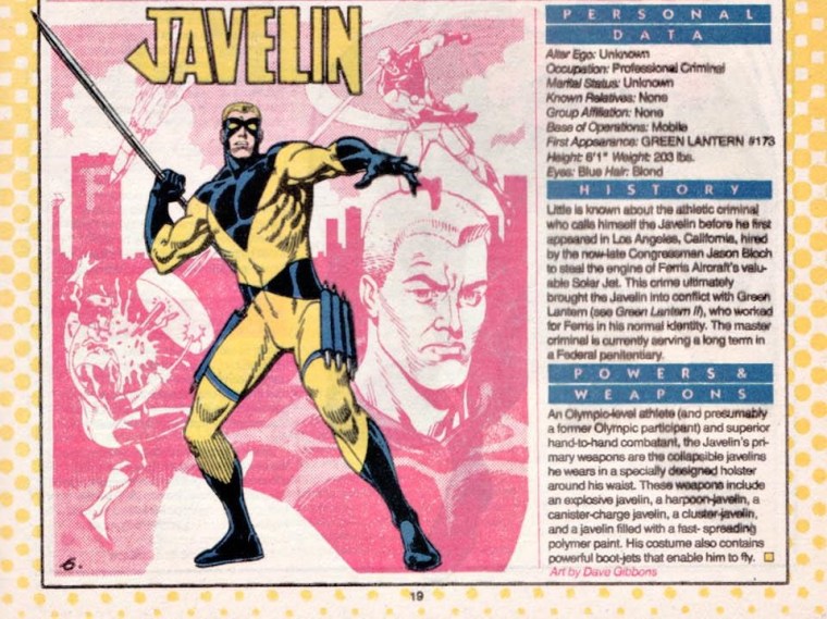 Javelin (DC) has a variety of tricked out javelins in DC Who’s Who V1 #11.