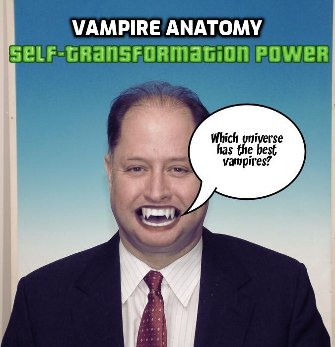 Vampire Anatomy – The character has the form and/or characteristics of a vampire. Vampire Anatomy is also known as Homines Nocturnae Physiology (Marvel Comics), Homo Nosferatu Vampiris Physiology (Humans Only), Vampire Mimicry, Vampire Physiology, Vampiric Mimicry, Vampiric Physiology, Vampirism, Vampyre Mimicry, Vampyre Physiology and Vrykolakas.