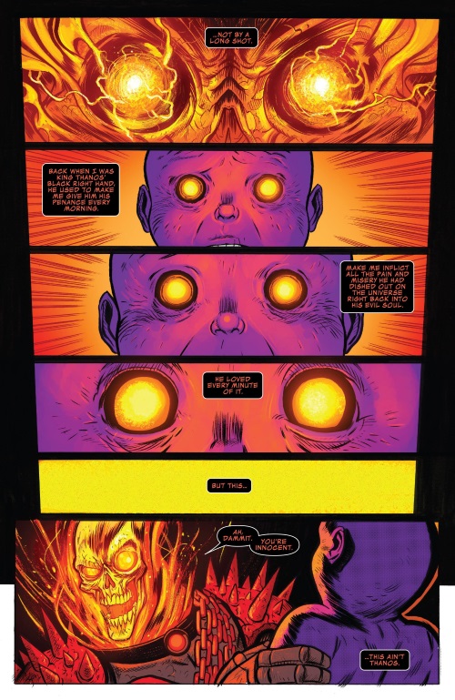 Thanos (Marvel) uses the penance stare to relive his sins with glee in Thanos #15.