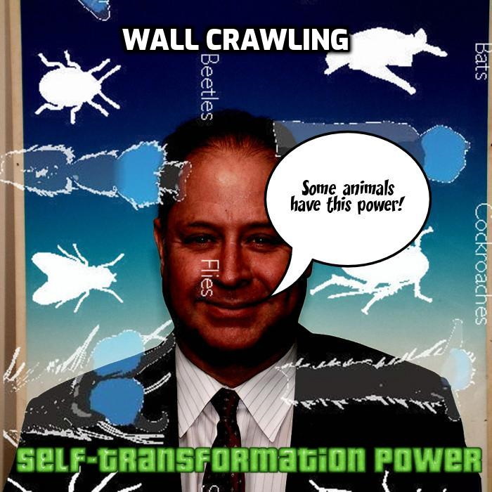 Wall Crawling – The ability to adhere to solid surfaces, including walls and ceilings. Wall Crawling is also known as Adhesive Climbing, Surface Scaling, Wall Adhesion, Wall Clinging and Wall Walking.