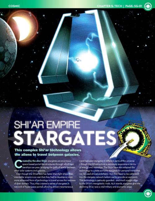 The Shi’ar Empire (Marvel) use a device called Stargates to create wormholes in order to connect their vast interstellar empire in Marvel Fact Files #30 (Eaglemoss).