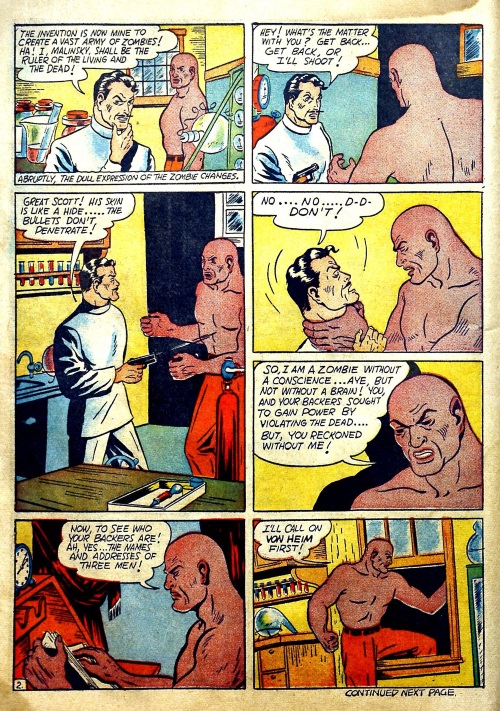 Purple Zombie seems to be the first zombie hero. The Purple Zombie appears in Heroic #1 (Eastern Color, 1940). As you can see the Purple Zombie is not purple.